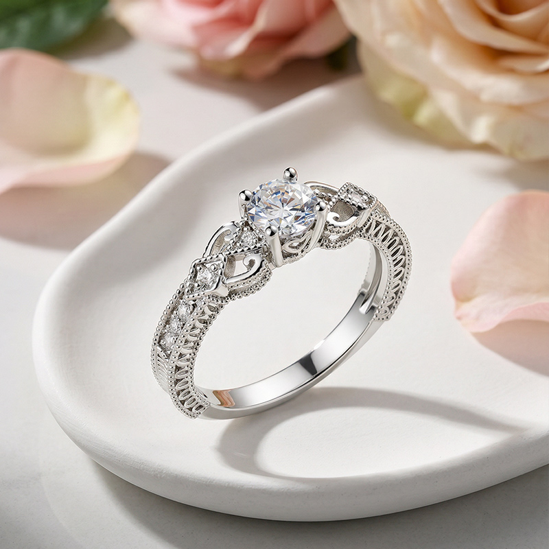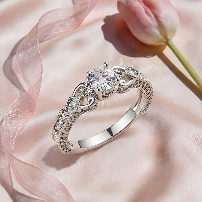 This timeless vintage promise ring from Jeulia exudes old-world romance, crafted in polished sterling silver. A brilliant round-cut center stone is framed by delicate heart-shaped outlines on each side, adding a sweet symbol of enduring love. Milgrain detailing traces the band and motifs, while tiny pavé stones accent the edges for subtle vintage sparkle. Comfortable for daily wear, this milgrain ring is a meaningful choice for promises, engagements, or anniversaries.