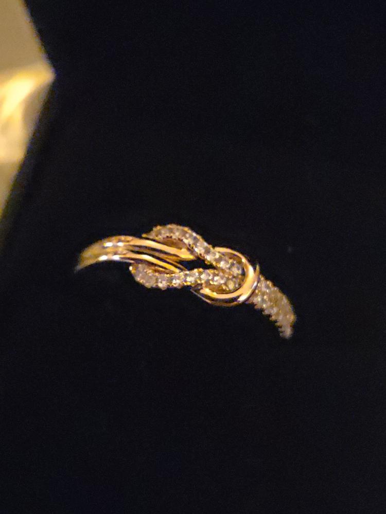 A brilliant way to show her your love is forever, this fashion ring will certainly touch her heart. This meaningful design showcases two ribbons interlocked for an infinity symbol-shaped look, while shimmering round stones add eye-catching sparkle. This band makes a stunning statement of everlasting love.