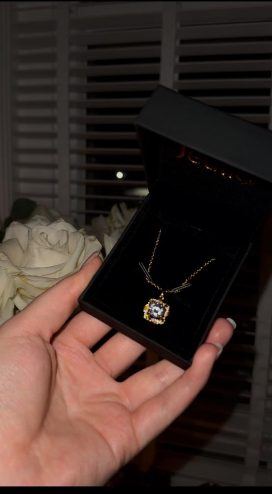 Full brilliance is revealed through delicate round stone and twisted halo. This charming design features a sparkling round cut stone at its center. Ribbons of gold-tone twist through the classic love knot design. Dainty and shimmering, this necklace is sure to cherish.