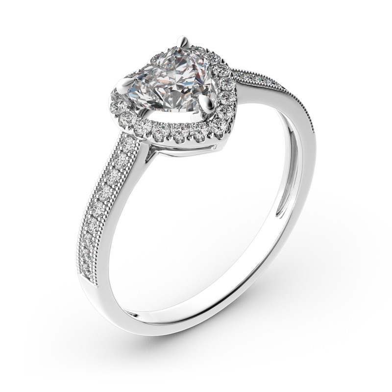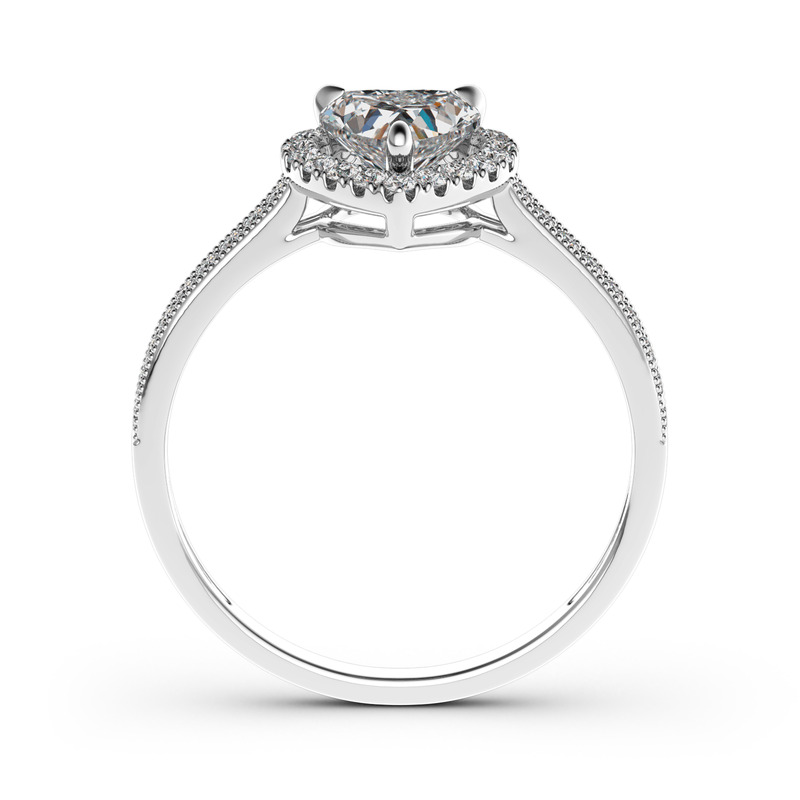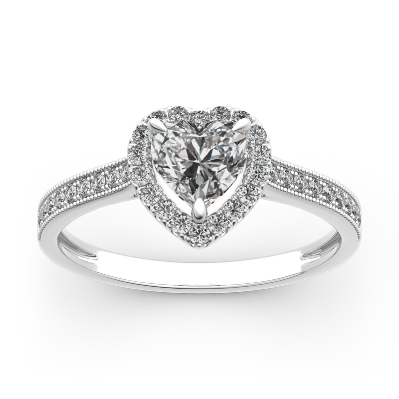 Elegant and romantic, this sweet engagement ring makes a stunning statement of love. It showcases a sparkling heart cut stone wrapped in a glistening halo frame of round stones, while additional stones glisten on the shank. Make your proposal something that you will be dreaming about for years to come, with this ring that are designed with love in mind. With multiple options for personalization, this beautiful style is a perfect gift for any lady or the perfect reason to spoil yourself!