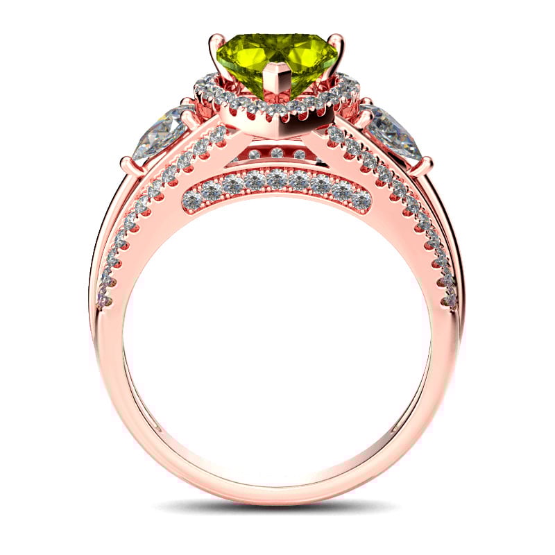 Let your love and commitment shine with this dazzling ring. This sweet design features a shimmering heart cut center stone wrapped in a halo frame of round stones, bringing out its beauty and sparkle. Two pear cut stones flank the center stone while additional stones adorn the shank, adding more sparkle to the design. With multiple options for personalization, this beautiful style is a perfect gift for any lady or the perfect reason to spoil yourself!