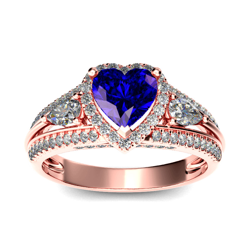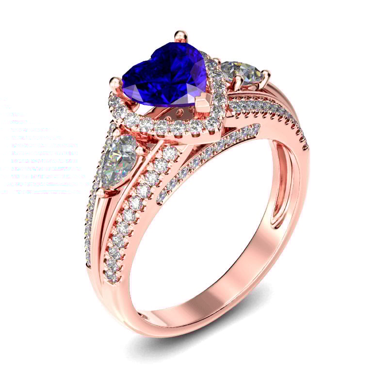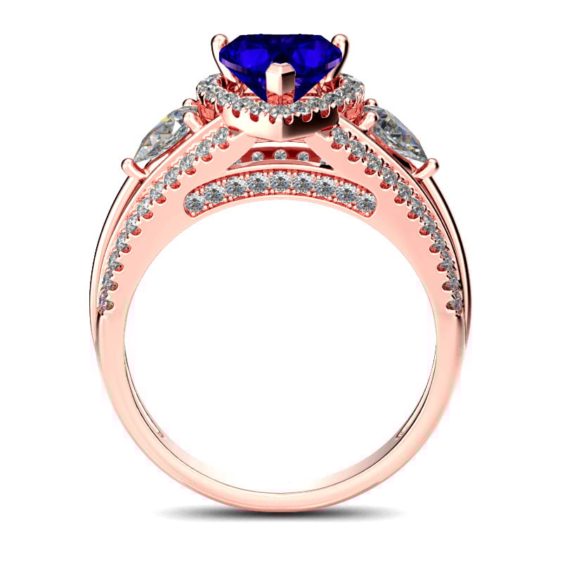 Let your love and commitment shine with this dazzling ring. This sweet design features a shimmering heart cut center stone wrapped in a halo frame of round stones, bringing out its beauty and sparkle. Two pear cut stones flank the center stone while additional stones adorn the shank, adding more sparkle to the design. With multiple options for personalization, this beautiful style is a perfect gift for any lady or the perfect reason to spoil yourself!