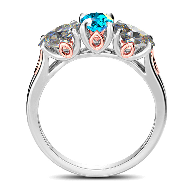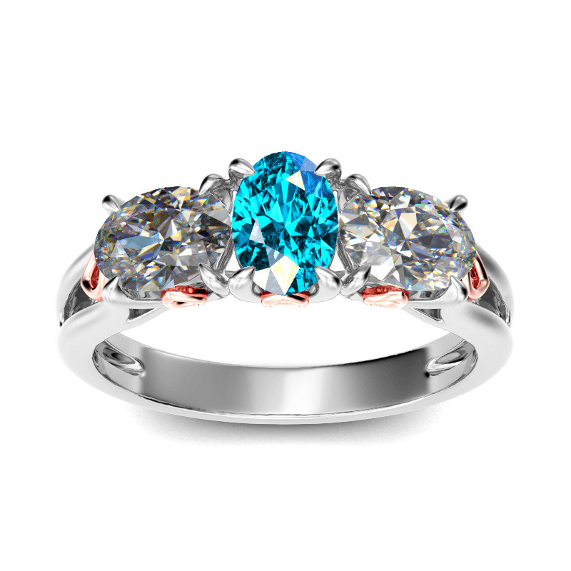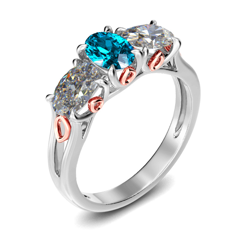 A unique and sparkling look, this engagement ring will capture your heart at first sight. Crafted in sterling silver, this beautiful design showcases three oval-cut stones set on a vintage-inspired mount. The split shank is sculptured with leaf shape. For this ring, you can customize the color of metal and the stones to make it one of kind and meaningful. Just move your finger to design a one of a kind ring for yourself.
