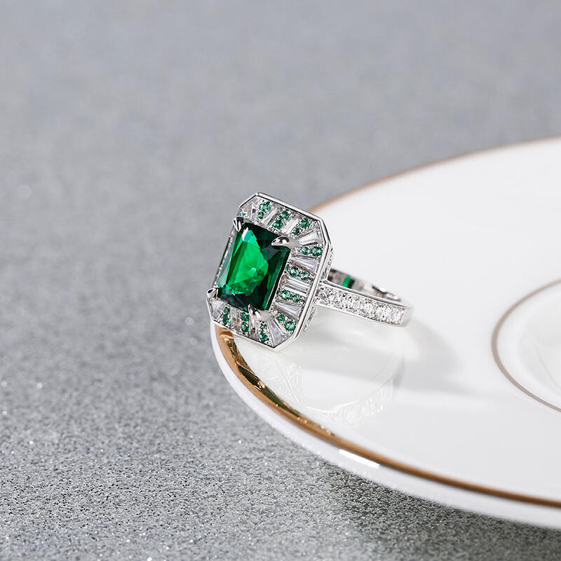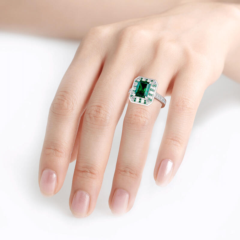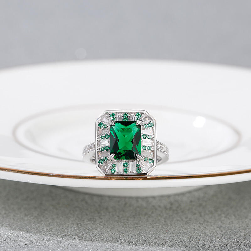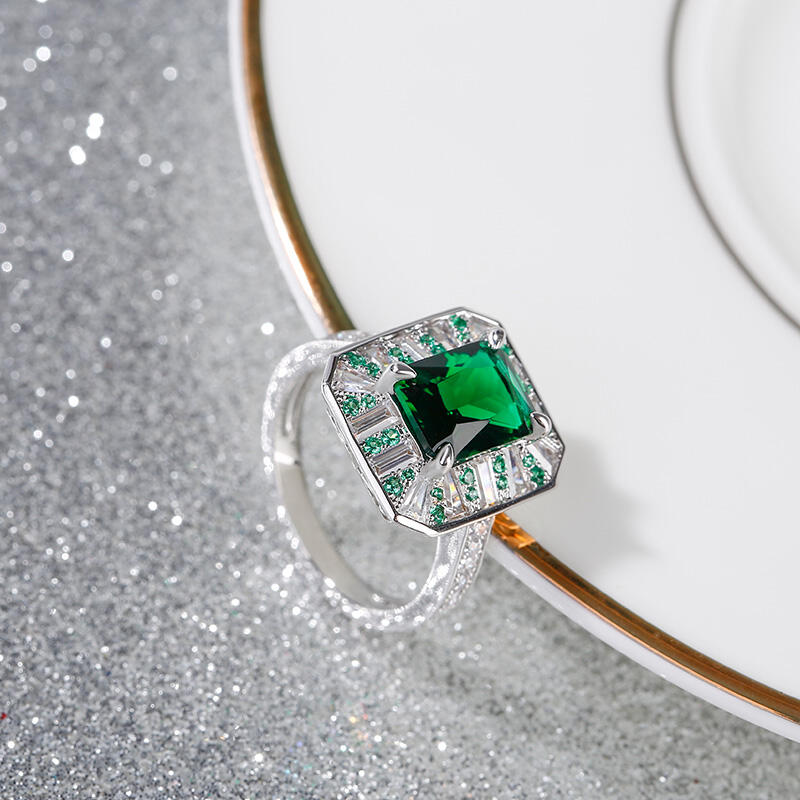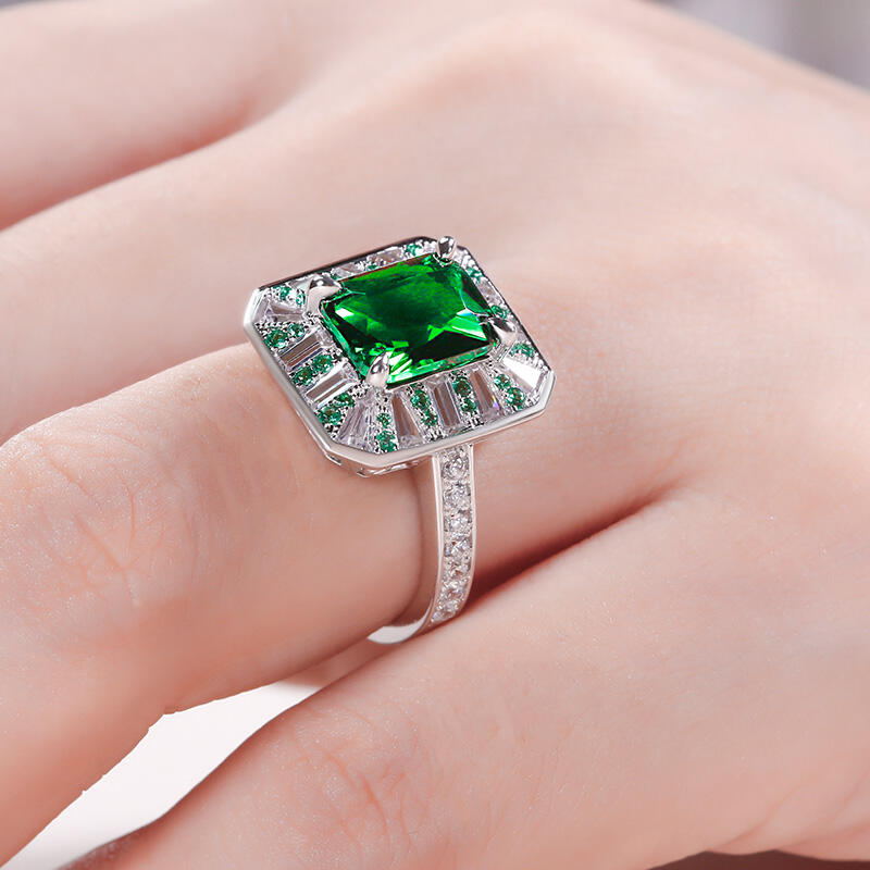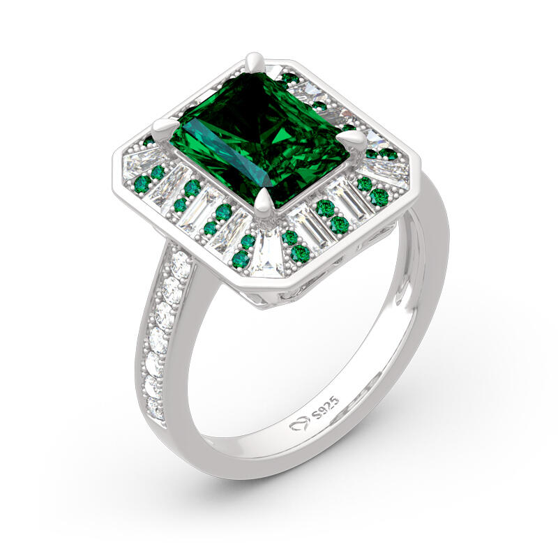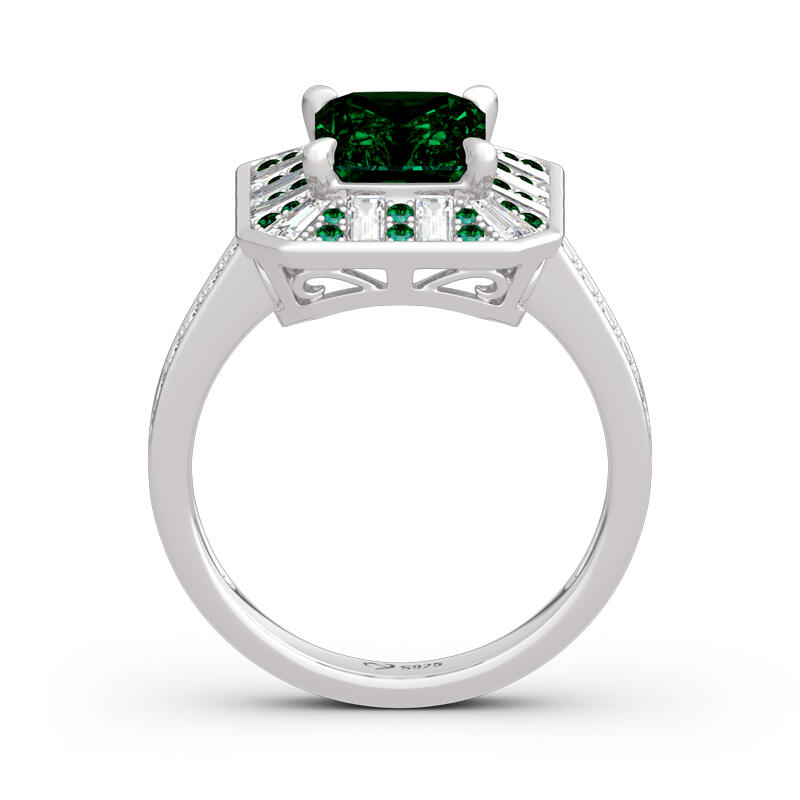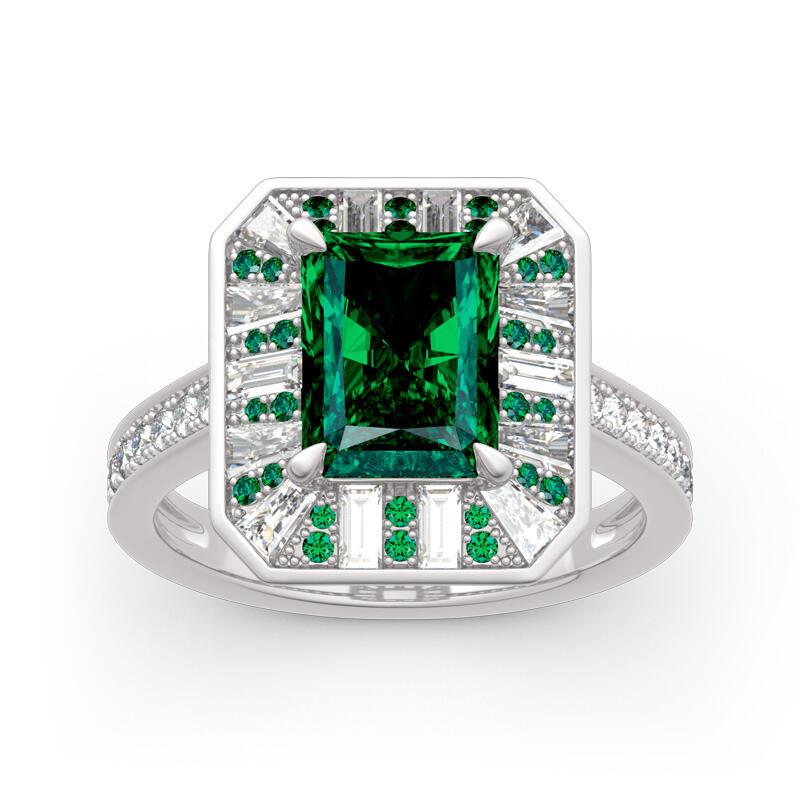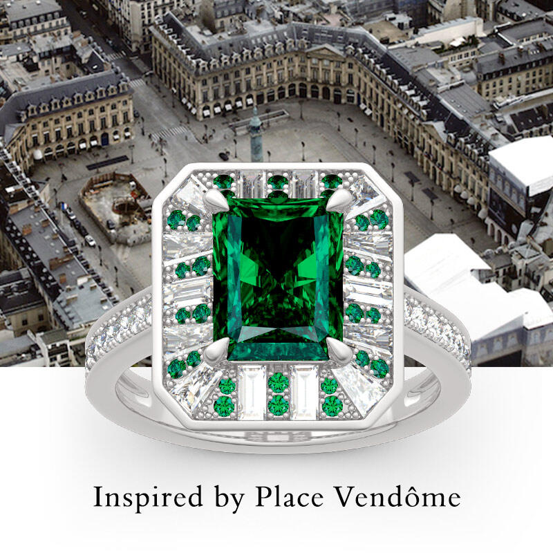 As world capital of jewellery, the Place Vendôme is one of the most famous squares in Paris and one of the most luxurious in the world. Start building your life together with this Place Vendôme inspired ring. Crafted in sterling silver, this charming choice features a glistening radiant cut center stone setting accented by small green stones and white stones. Additional round stones glisten on ring's shank to add extra sparkles. So striking,this vintage ring is a look she'll simply adore.