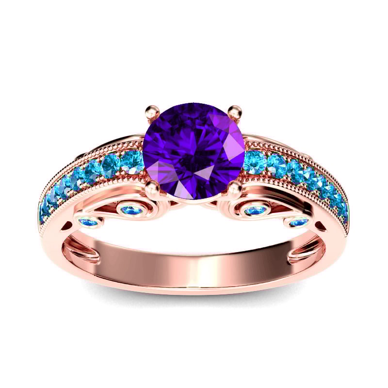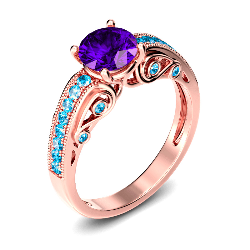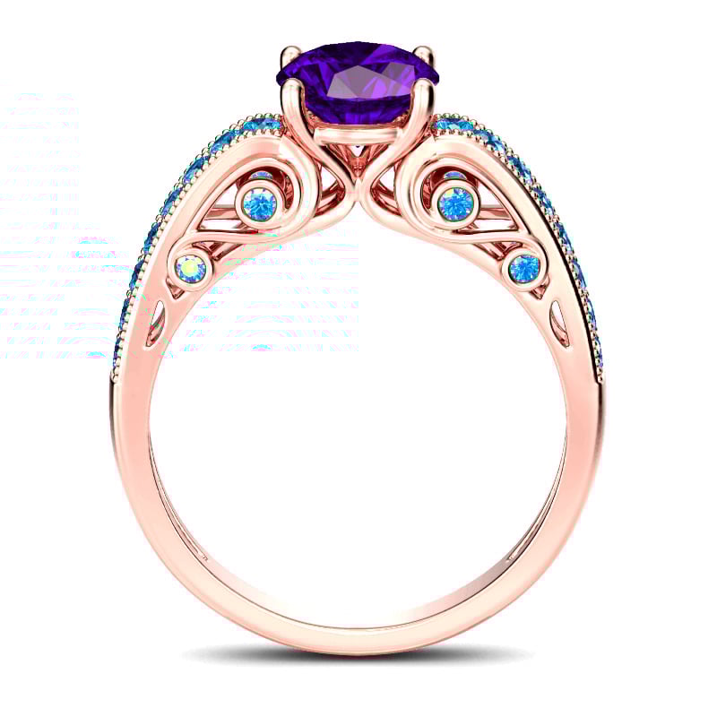 A brilliant celebration of your love, this sparkling engagement ring symbolizes your unforgettable moments. Crafted in sterling silver, the ring shimmers with a sparkling round cut center stone. A row of shimmering round stones adorn the shank for a touch of sparkle.Filigree and milgrain detailing along the shank add vintage elegance and completes the design.With multiple options for personalization, this beautiful style is a perfect gift for any lady or the perfect reason to spoil yourself!
