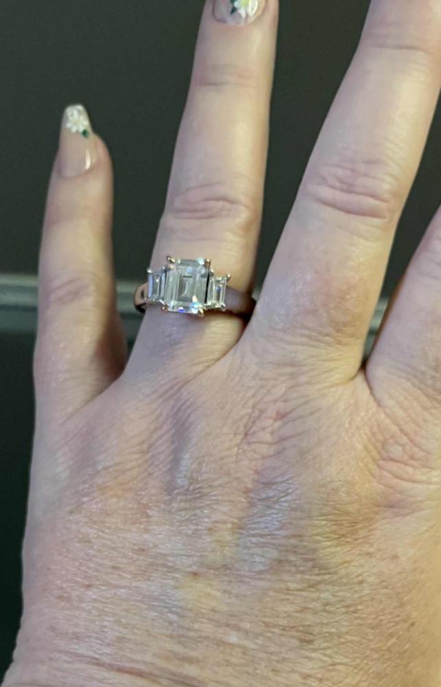 Luxurious and breathtaking, this engagement ring honors the light of your life. Crafted in two tone sterling silver, the ring features an emerald-cut center stone accented with two taper baguette-cut stones on a high polished shank. The shank is buffed to show a bright shine and elegant look. The delicate rose gold tone filigree details on the side of the ring adds elegance and vintage aesthetics to it. Surprised her with this masterpiece!