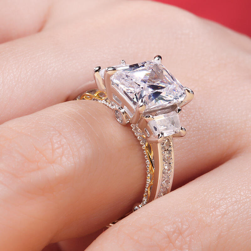 Exquisite and stunning, this engagement ring honors the light of your life. Crafted in two tone sterling silver, the ring features a three-stone design at the head. They show a sparkling look from every angle. The delicate gold tone filigree details on the side of the ring adds elegance and vintage aesthetics to it. Surprised her with this masterpiece!